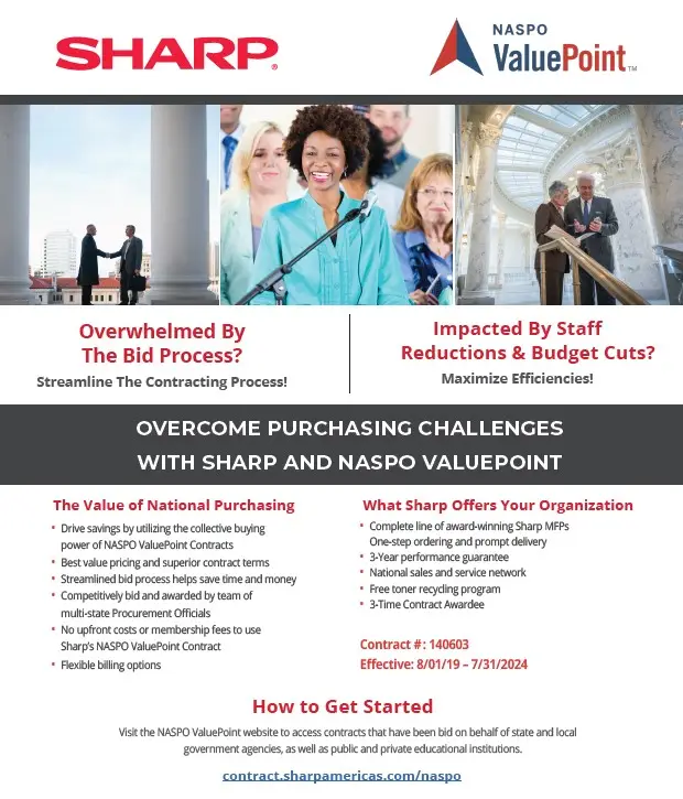 Sharp helps Federal, State and local governments meet security requirements with our award-winning MFPs that include built-in protection for documents and enhanced security options including a convenient end-of-lease feature that overwrites all data, including document filing, user data, job status, date and address book.