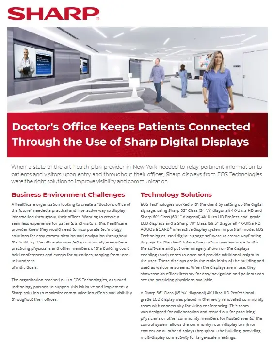 Sharp AQUOS BOARD® interactive display systems offer a complete digital solution for collaborative meetings, presentations, video conferencing, live data and interactive digital signage in a corporate setting. With this solution, healthcare organizations can communicate, collaborate and disseminate information in real-time, globally.