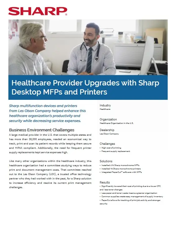 Patient care and cost containment are of paramount importance in the healthcare industry. Sharp offers a wide array of high technology products that can be used in hospital reception areas, patient rooms, administrative offices, and teaching environments. Recognized as one of the leaders in document security, Sharp MFPs help ensure patient records are kept secure.
