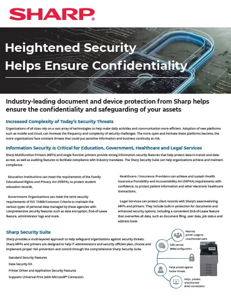 As MFPs and printers become parts of organizations’ integrated document workflows and business processes, security becomes a serious concern. Securely managing business and user data is critical for corporations to be successful. Sharp addresses these concerns by providing a suite of integrated security features designed to help protect your information and document assets.